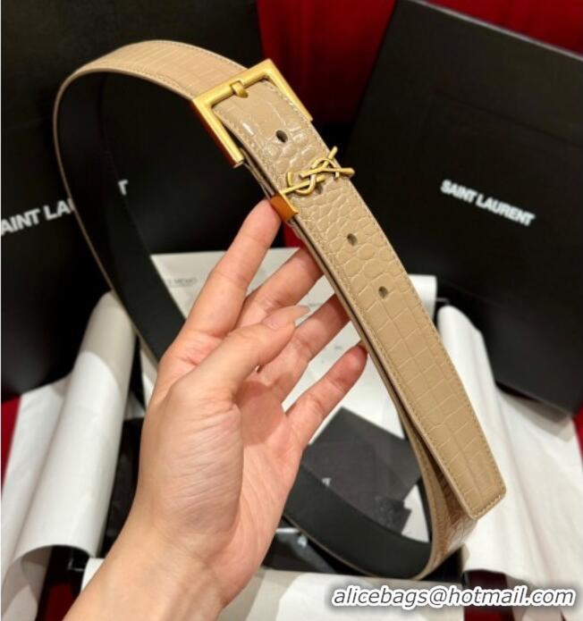 Top Grade Saint Laurent Crocodile Embossed Leather Belt 3cm with Pink Buckle YSL011001 Beige 2025
