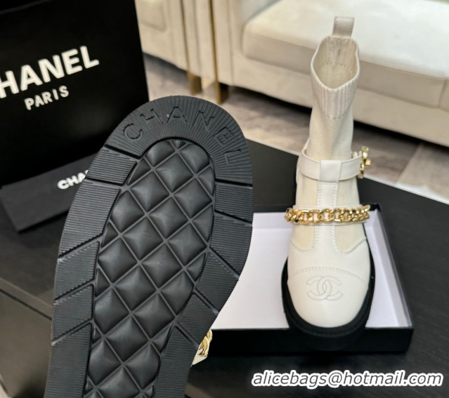 Design Chanel Knit & Calfskin Leather Ankle Boots with Chain White 2025 CH110406 1104039