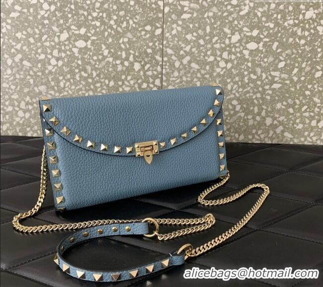 Top Quality Valentino Rockstud Wallet with Chain in Grainy Calfskin 059 Dusty Blue 2024