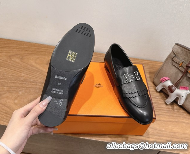Elegant Hermes Royal Loafers in Calfskin Leather with Fringe Black 2025 H082006 0820053