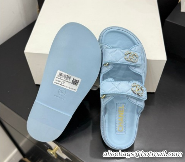 Good Product Chanel Lambskin Leather Strap Flat Slides Sandal with Chain CC CH030614 Light Blue 2026