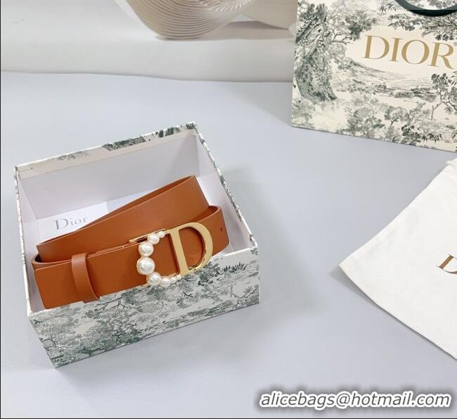 Trendy Design Dior Calfskin Leather Belt 3cm with Pearls CD Buckle 0108 Brown 2025