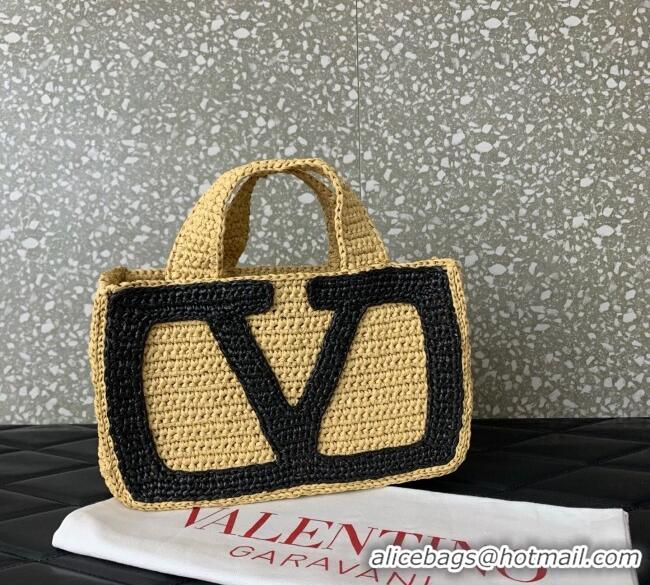 Trendy Design Valentino Viva Superstar Crochet Small Shopping Bag in Raffia Straw 0110S Beige/Black 2025