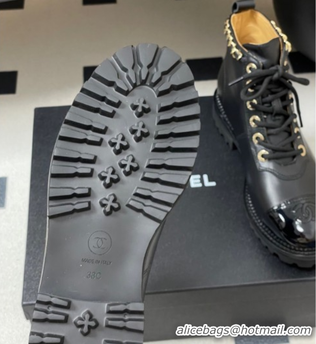 Luxury Cheap Chanel Calfskin and Patent Leather Laced-up Ankle Boots 3.5cm with Chain Black 2025 CH110404 1104033