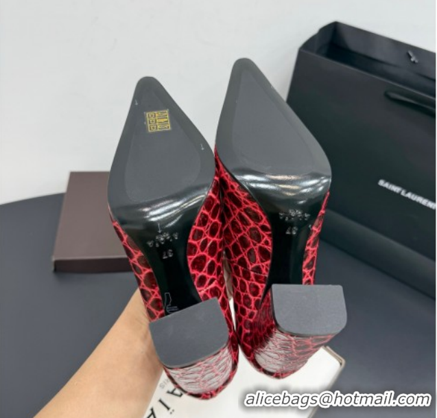 Unique Style Alaia Pointy Toe Pumps 9cm with Block Heel in Crocodile Embossed Leather Red 1029106