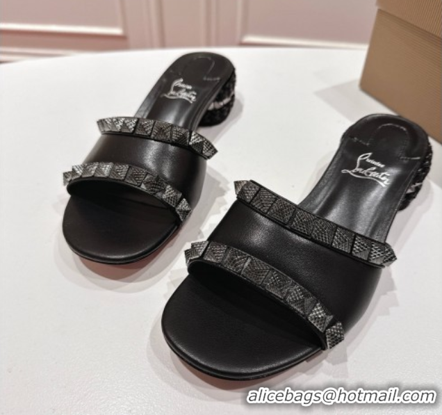 Unique Style Christian Louboutin Pyrasand Heel Slides Sandal 5.5cm in Waxed Leather with Spike Studs Black 1030131