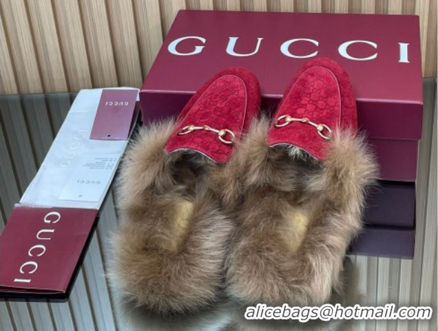 Duplicate Gucci Jordaan GG Suede and Wool Flat Slipper with Horsebit Red 2025 GG102003 1020060