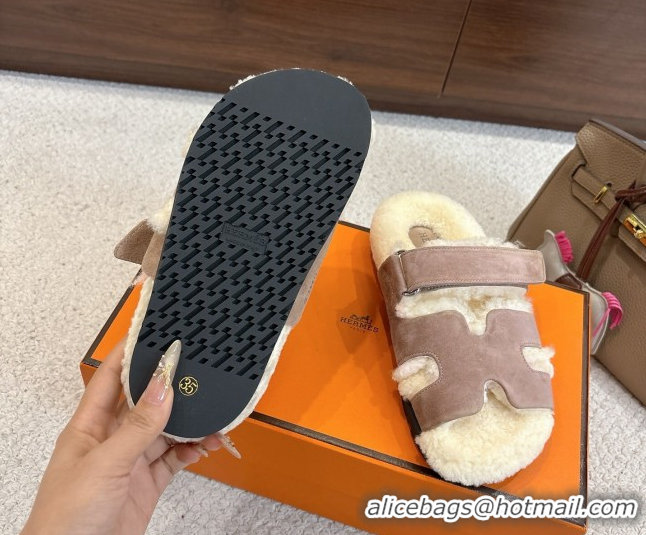 Unique Style Hermes Chypre Flat Slides Sandal in Suede and Shearling Grey H102307 1023118
