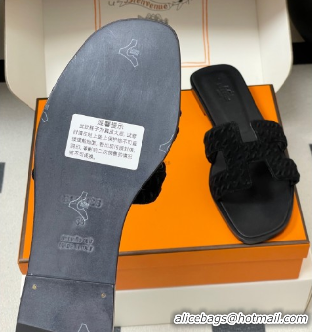 Charming Hermes Classic Oran Flat Slides Sandal in Braided Suede Black 1023097