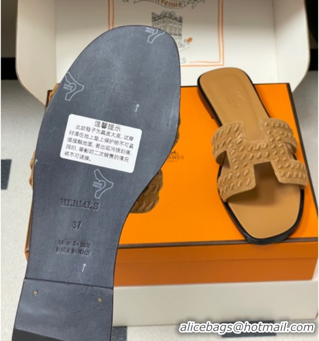 Best Grade Hermes Classic Oran Flat Slides Sandal in Braided Suede Brown 1023099