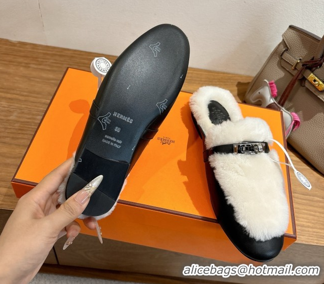 Good Quality Hermes Oz Flat Loafers in Calfskin and Wool with Kelly Buckle Black 1023008