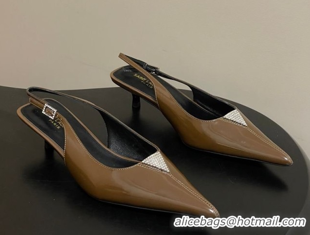 Good Quality Saint Laurent Shiny Leather Slingback Pumps 4cm with Buckle and Strass Khaki 2026 SL082501