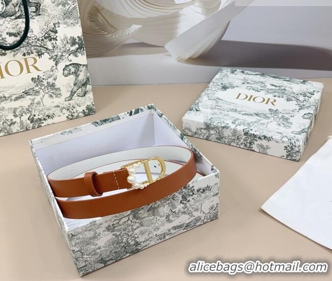 Well Crafted Dior Calfskin Leather Belt 2cm with Pearls CD Buckle 0108 Brown/White 2025