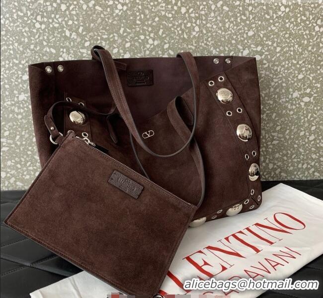 Famous Brand Valentino Medium Nellcote Shopping Bag in Suede with Ball Studs 0076 Dark Brown 2025